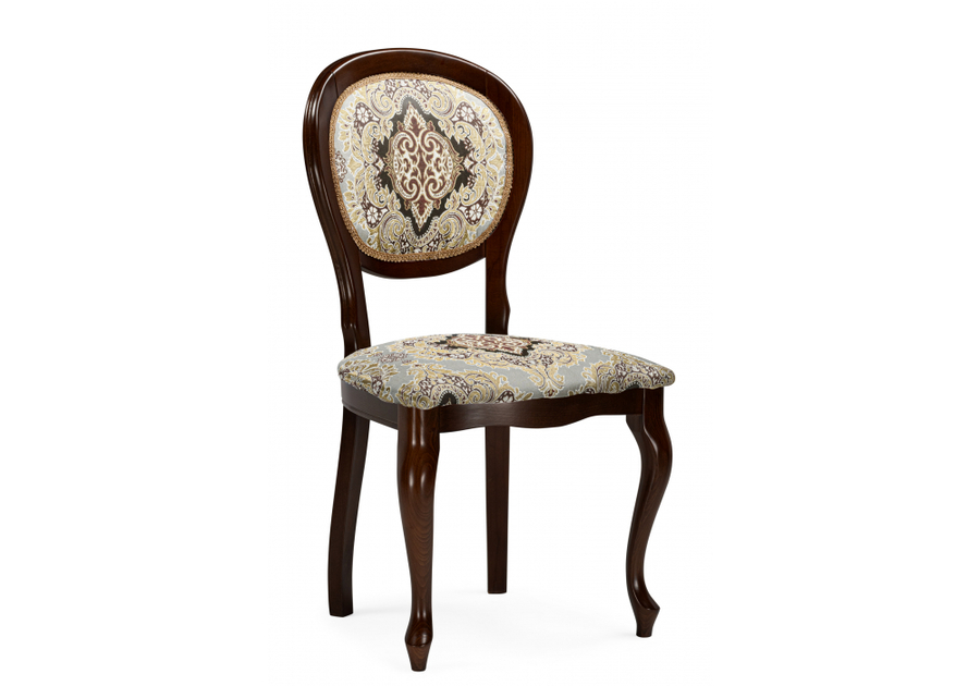 Кресло Adriano 082 не имеет резьбы и патины. Каркас и ножки выполнены из массива бука. Спинка и сиденье обтянуты узорной тканью бежевого цвета.